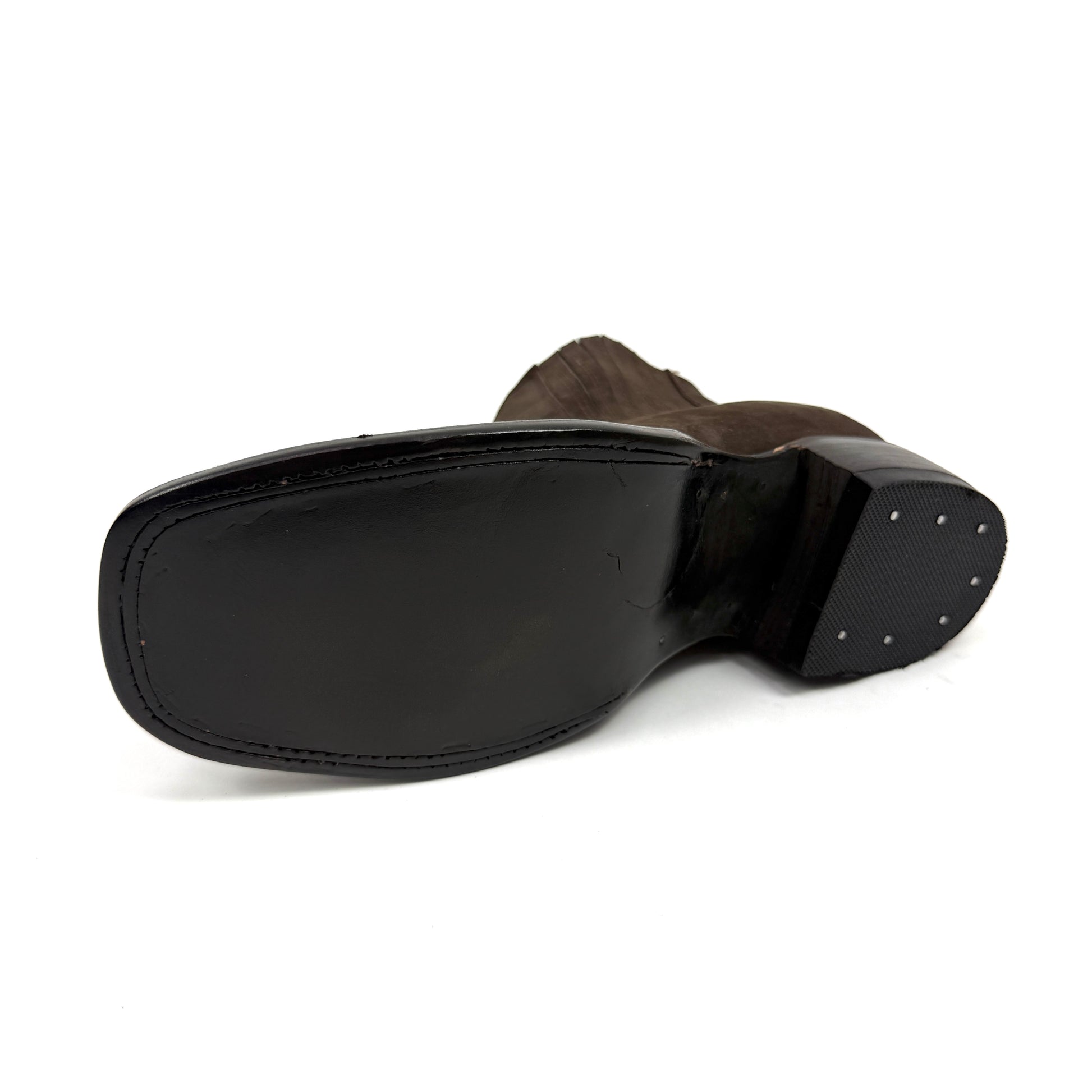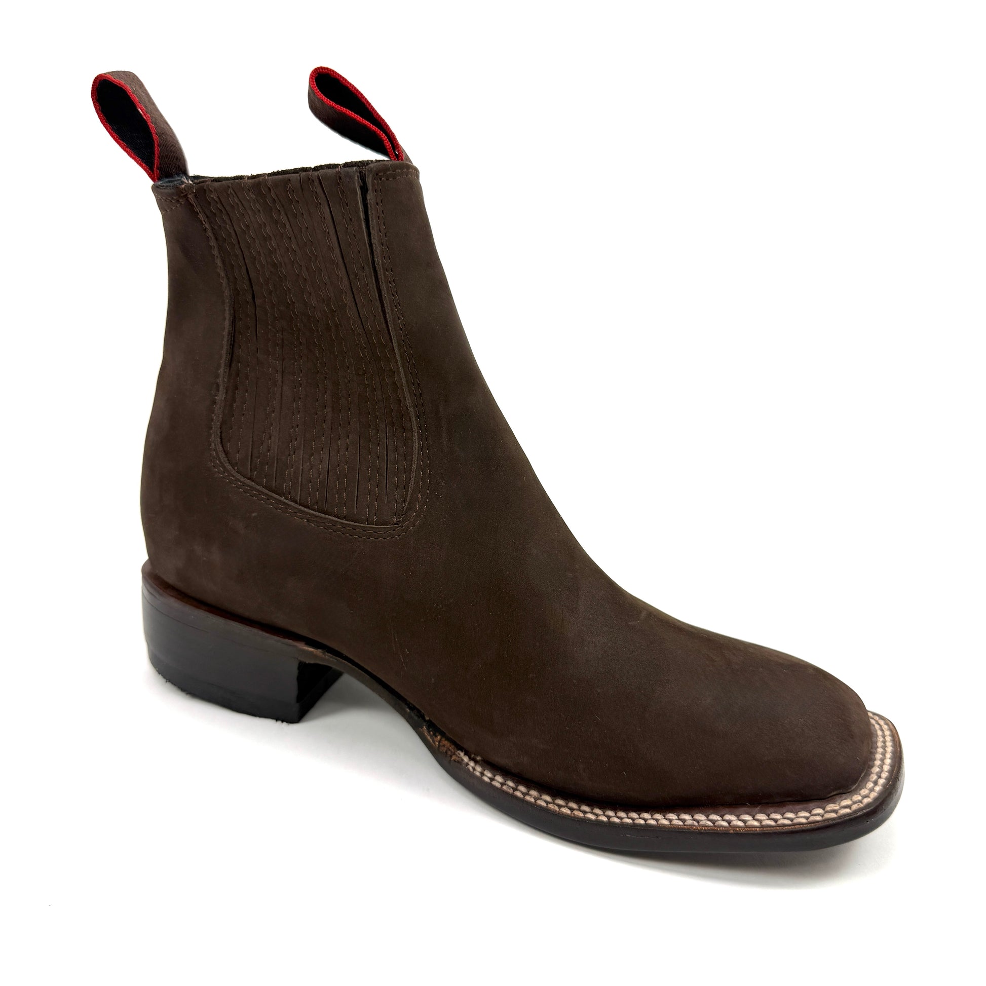 Brown suede ankle boot with square toe, side elastic panels, and pull tabs for easy wear. Classic and versatile Western style.