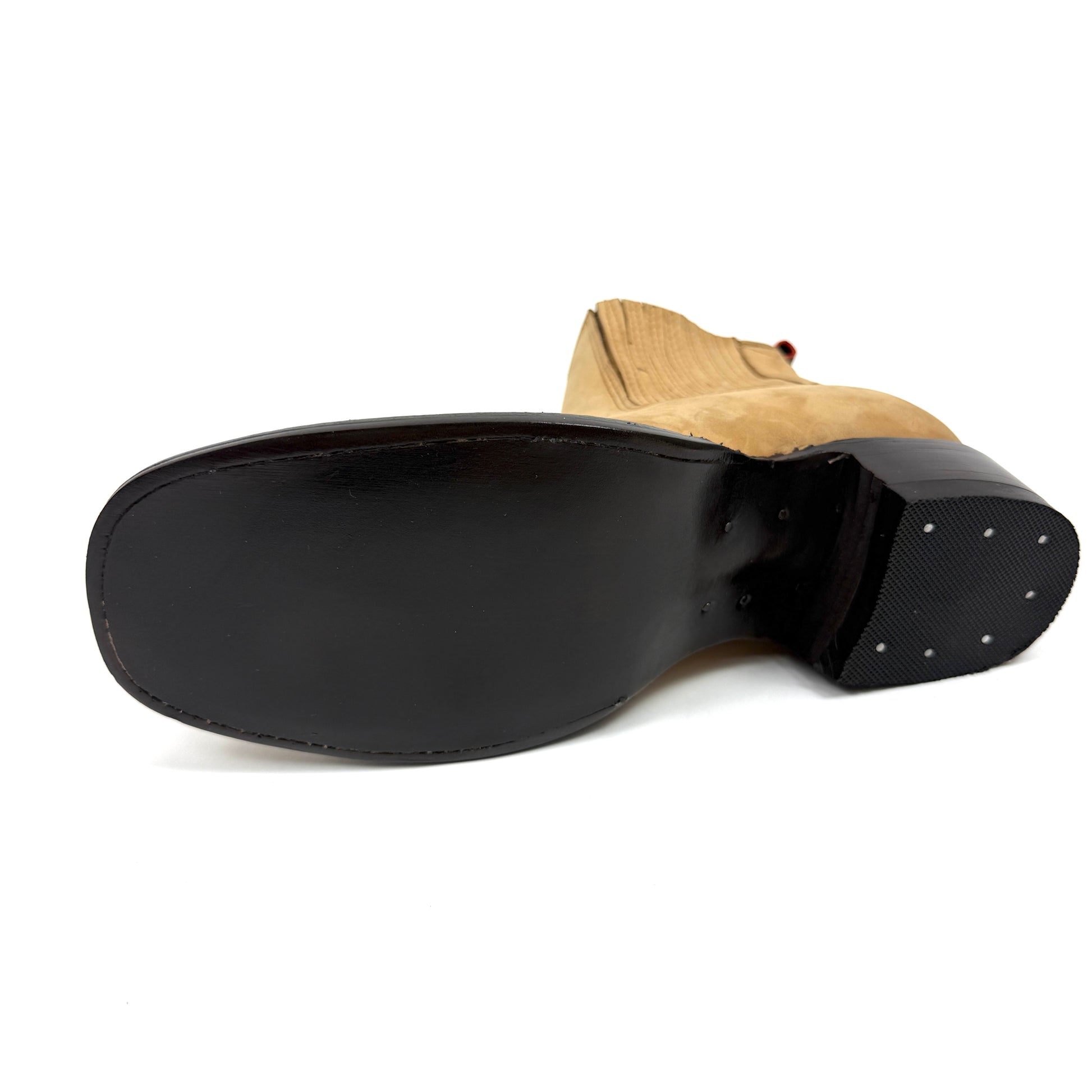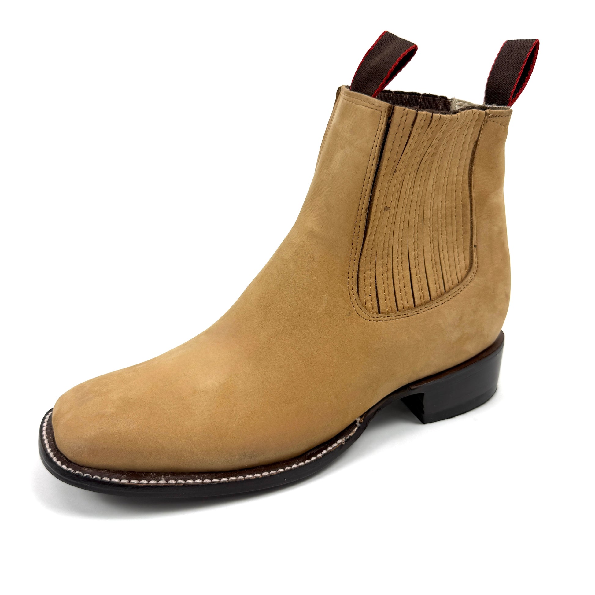 Light tan suede ankle boot with square toe, elastic side panels, and rear pull tabs. Sleek and stylish Western-inspired design.