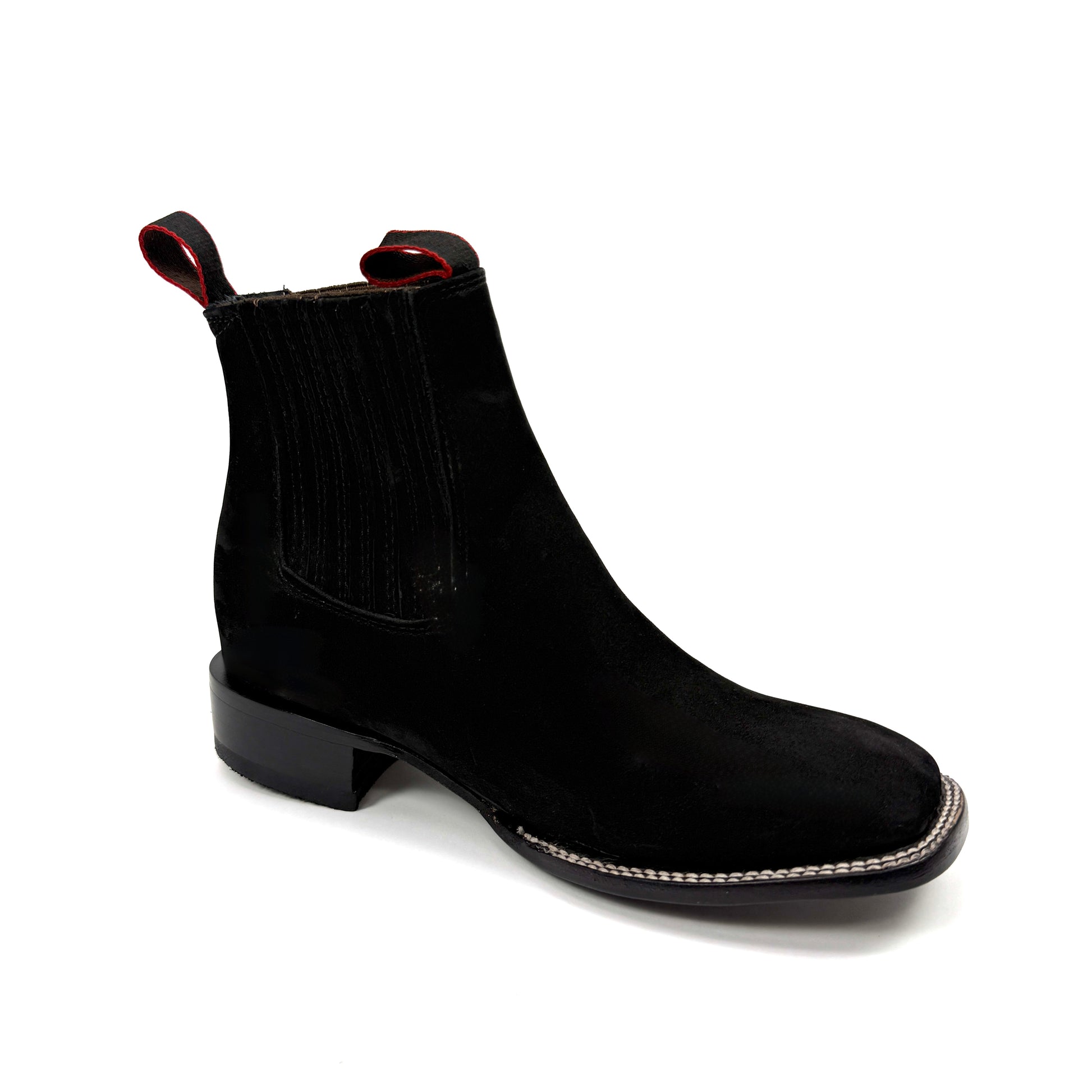Black suede ankle boot with square toe, matching side elastic, and red-detailed pull tabs. Timeless and versatile Western look.