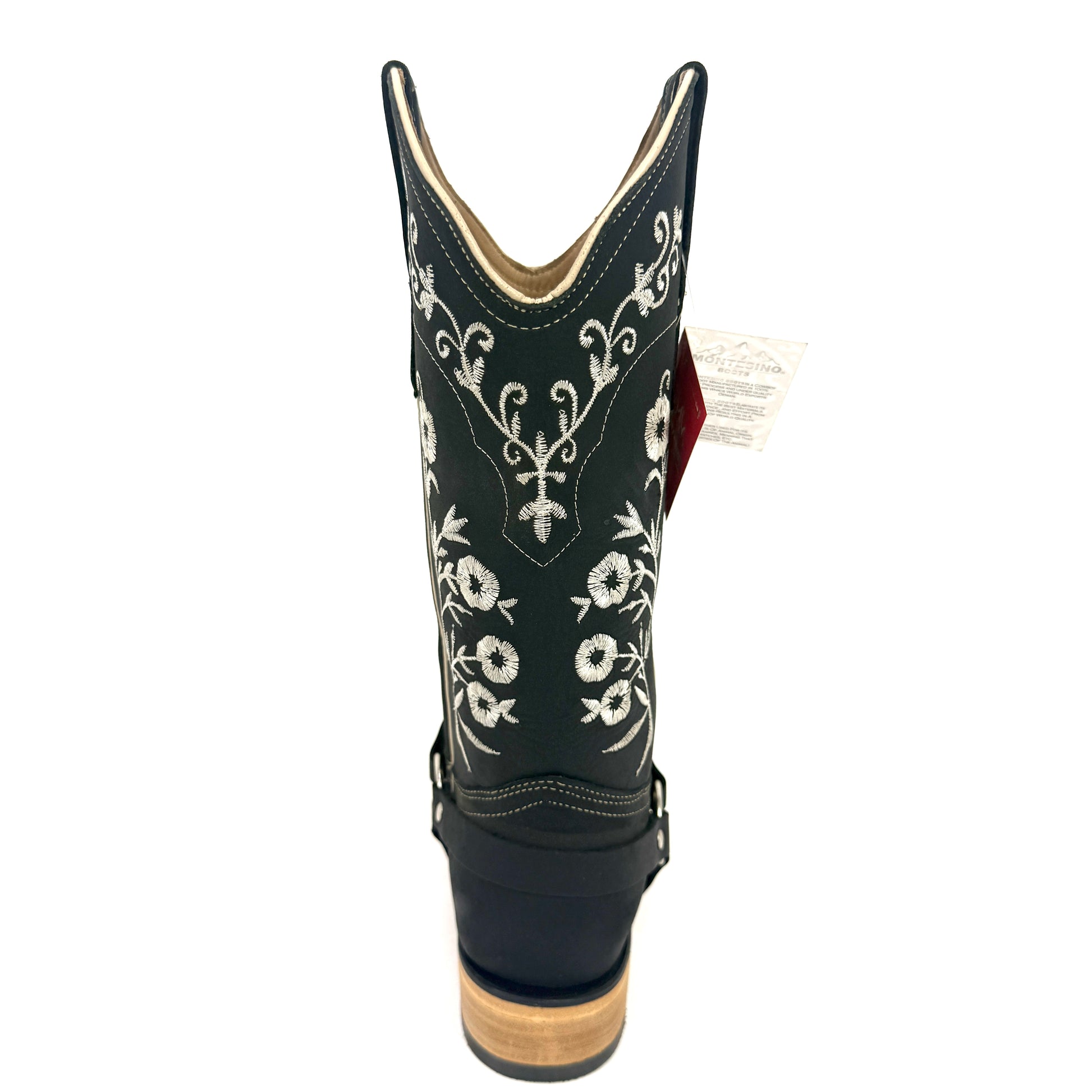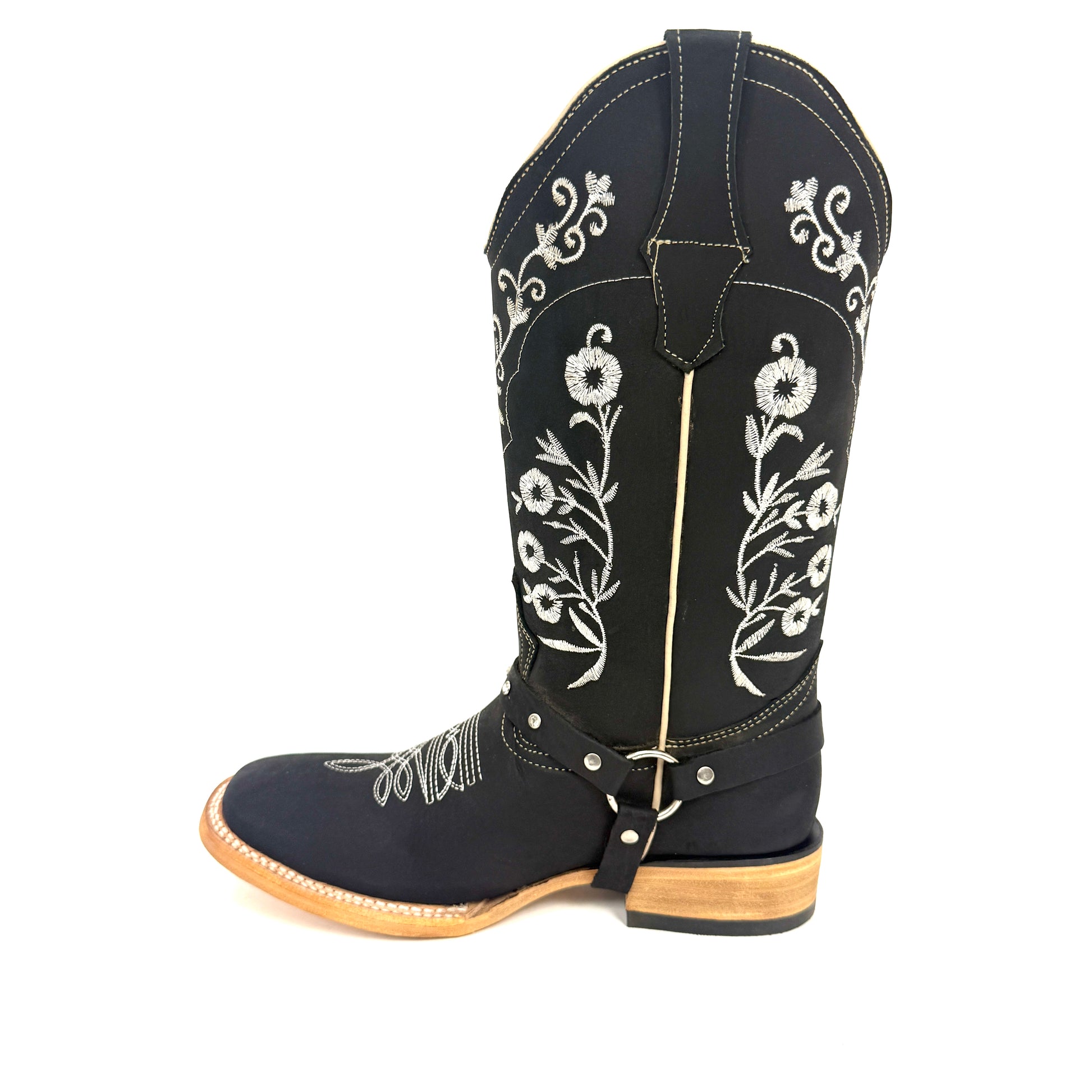 Black leather cowboy boot featuring white floral embroidery, decorative stitching on the vamp, and a studded harness strap for a bold Western look.